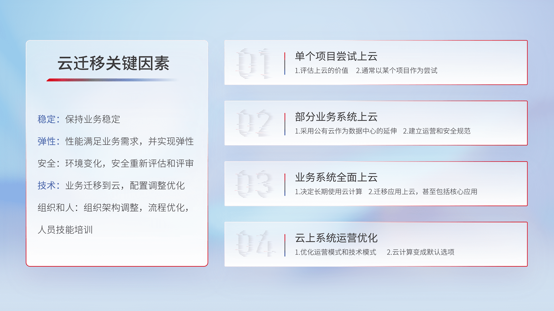 结合实际业务,,从规划设计、、、云平台选型、、、、云原生改造、、数据迁移、、、集成交付,,,迁移全过程为客户识别最佳上云路径,,,,做好风险识别管理,,,设计网络架构、、、、身份权限、、、安全审计合规、、、操作审计、、、、日志审计、、监控告警策略、、、、多站点容灾设计等,,对云上基础设施进行整体规划,,,,提升IT治理水平,,,以满足弹性、、高可用、、高性能的需求。。。。